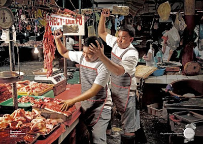 If you were a Philippine butcher, who had persistent headaches, do you think you’d want this headache relief medicine? Heck, you’d want it no matter what job you have. I understood what the ad was for even without reading the tagline. It gets the message across perfectly. Even for people who don’t quite get the message, it certainly grabs the attention of anyone passing. I think this ad would work anywhere, even in the U.S. because it’s simple, but effective and it just jumps off the page. You might be afraid for the guys life until you realize it’s a play on the fact that he’s giving himself a headache. Even in the two scenes below, you still can comprehend the message. And it’s great if there’s not a lot of information overload going on because the picture is so filled with other objects. However, if these were in a place like Time Square, they may get lost in the jumble of everything going on.